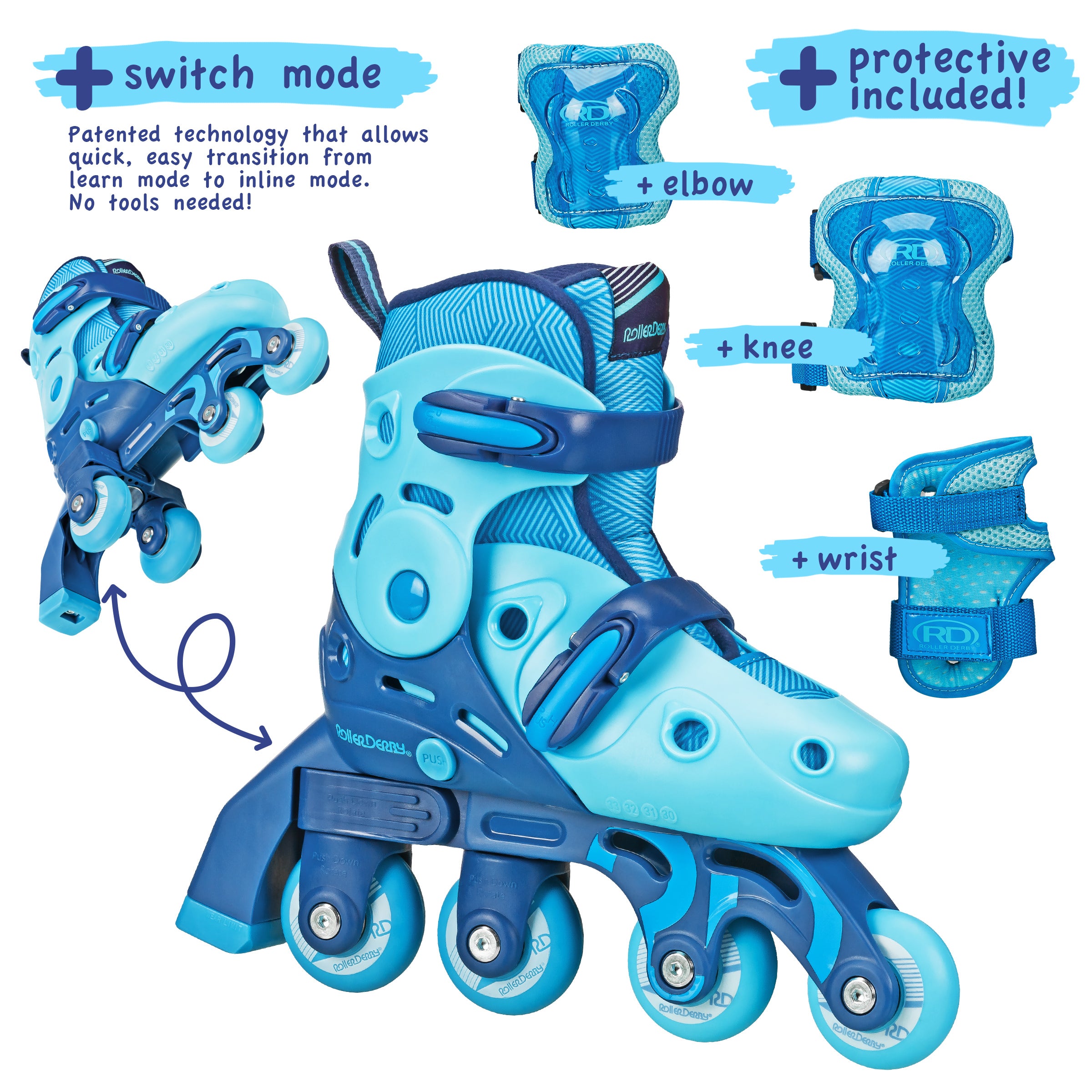 INCLUDES PROTECTIVE - ELBOWS,KNEES,WRIST Get ready for the perfect blend of fun and learning with the Switch Skates by Roller Derby! Designed for growing kids, the Switch offers a unique 2-in-1 experience, transforming from a training mode to inline skates as your child’s confidence builds. Parents love the easy, tool-free...